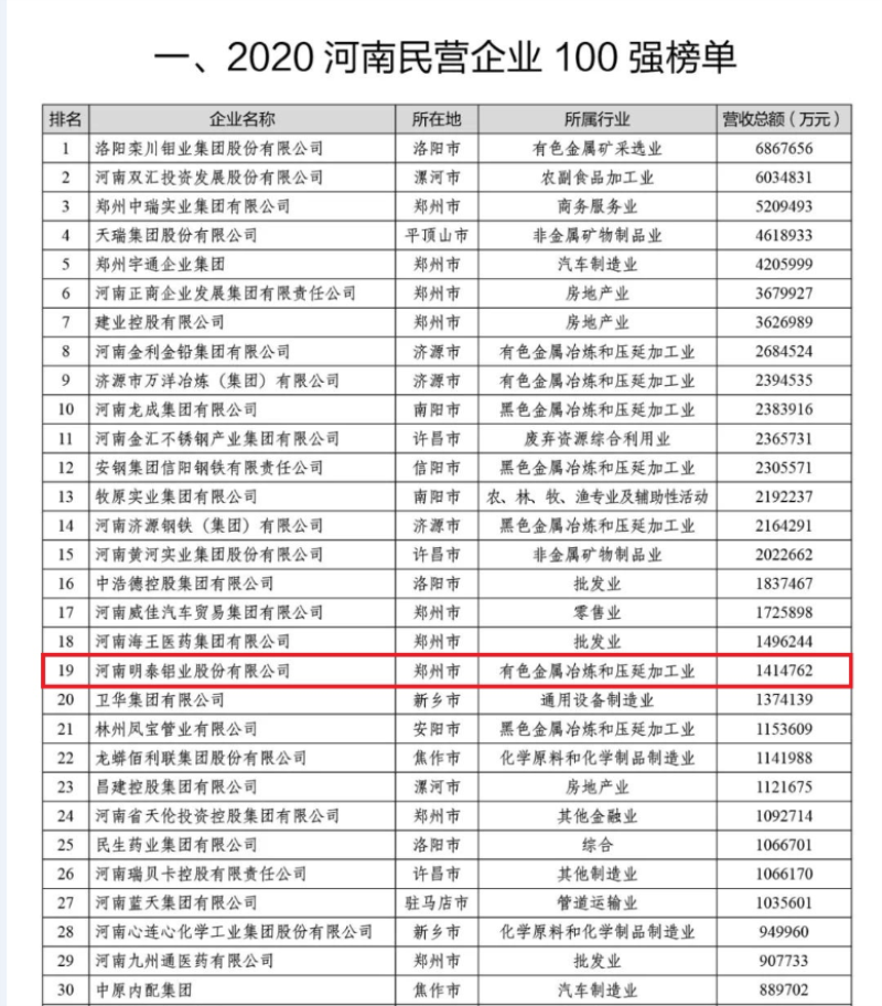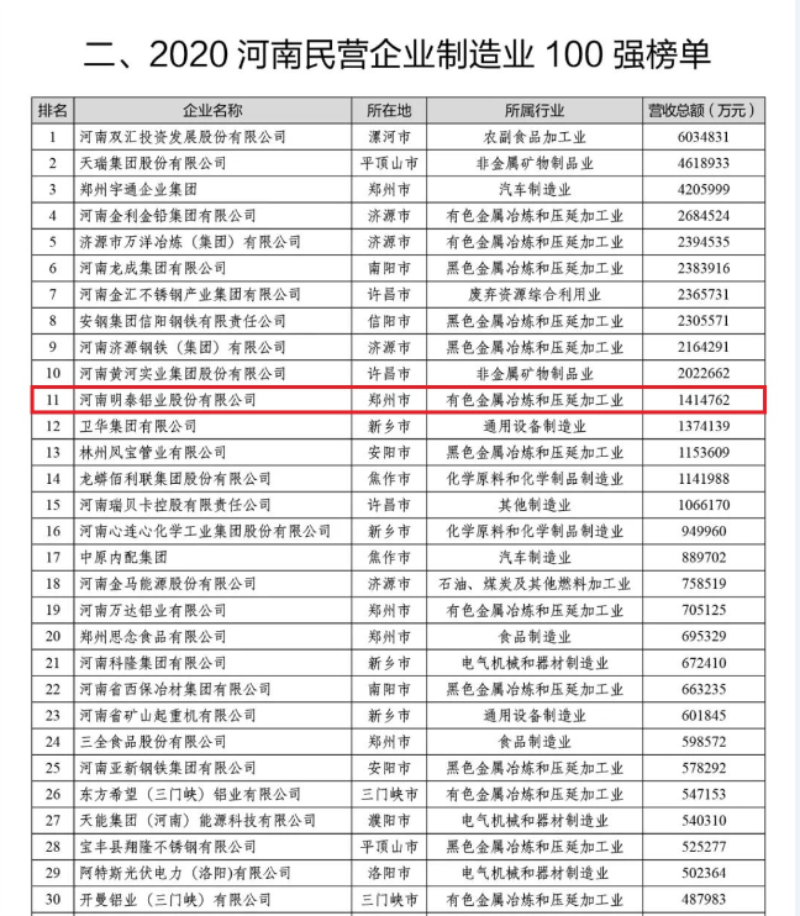 發(fā)布會(huì)上,明泰鋁業(yè)憑借141.4億的營(yíng)業(yè)總額再次入選2020河南民營(yíng)企業(yè)100強(qiáng)榜單和2020河南民營(yíng)企業(yè)制造業(yè)100強(qiáng)榜單,分別位列第19位、第11位。近年來,明泰鋁業(yè)不斷深化產(chǎn)業(yè)結(jié)構(gòu)與升級(jí),主動(dòng)履行社會(huì)責(zé)任,加快企業(yè)邁向高質(zhì)量發(fā)展的步伐。又一次榮登雙百強(qiáng)榜單,是社會(huì)各界對(duì)明泰鋁業(yè)近年來快速發(fā)展的肯定,也標(biāo)志著明泰鋁業(yè)在全省民營(yíng)企業(yè)中的重要作用和地位。